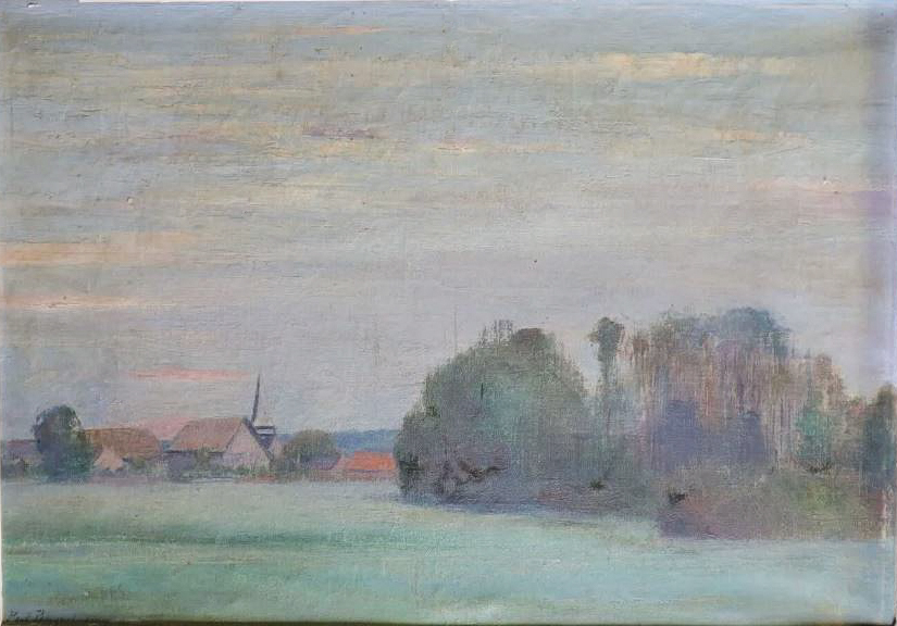 Au printemps 1896, lors d’un séjour à Coeuvres, Paul Bocquet réalise l’une de ses premières grandes toiles abouties, consacrée à la vallée de Saint-Pierre-Aigle, située à quelques kilomètres du village familial. L’artiste se rend sur le motif à bicyclette et choisit un point de vue dominant, à la lisière de la forêt, d’où il découvre le village étagé dans une légère brume matinale.