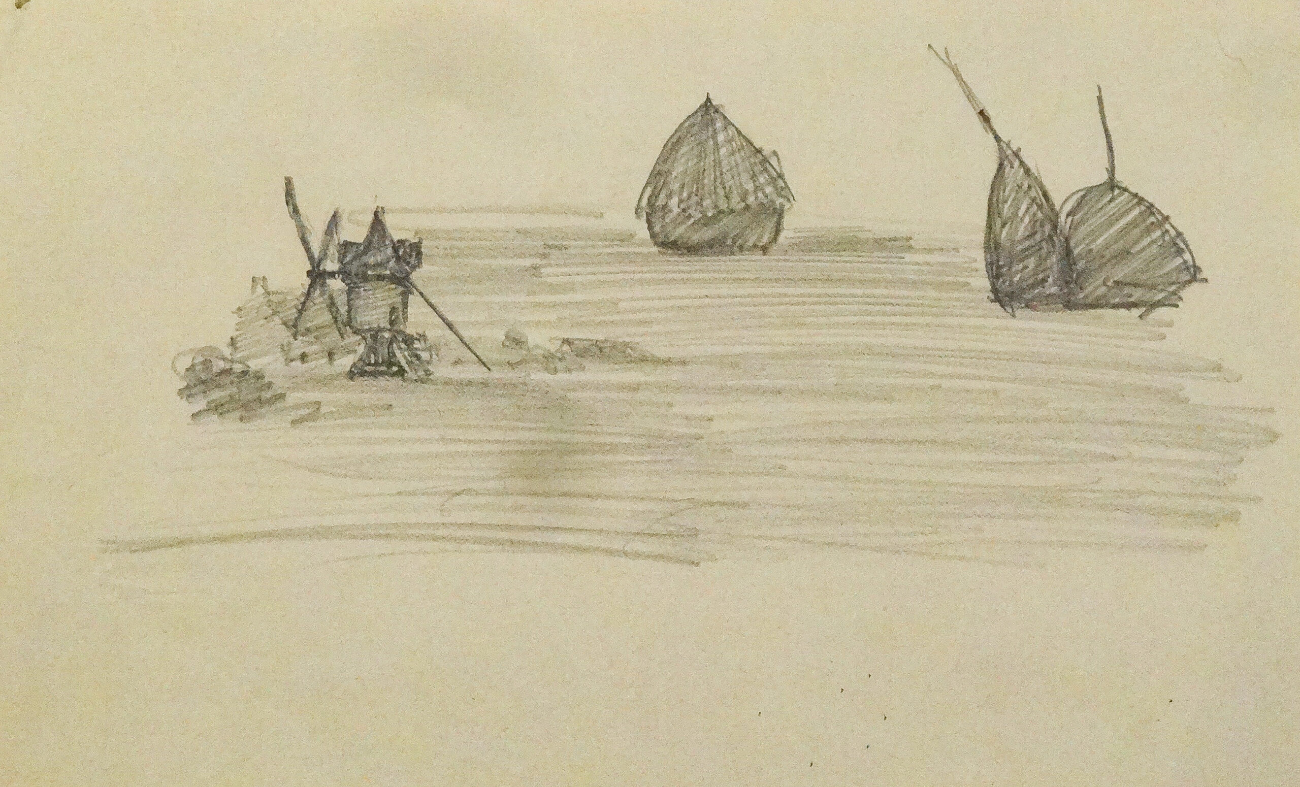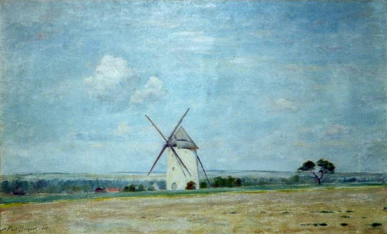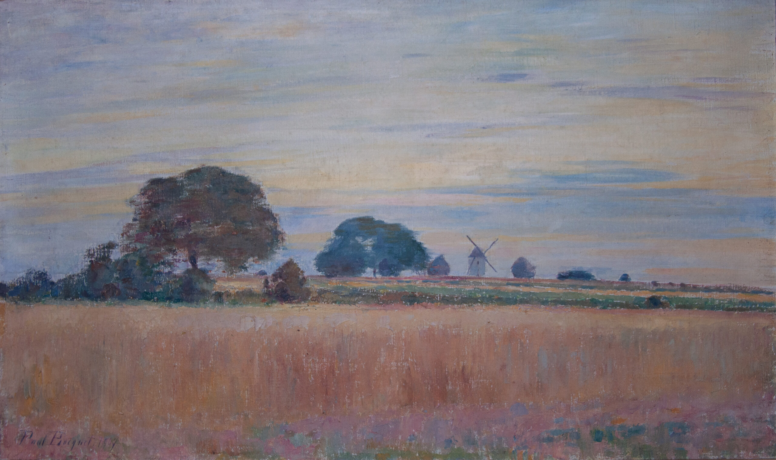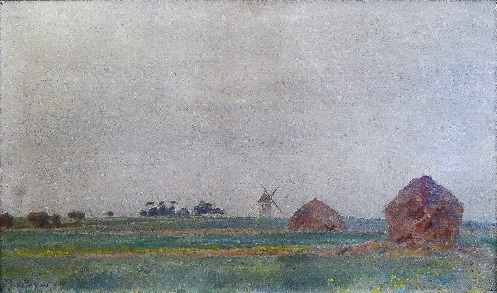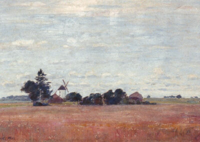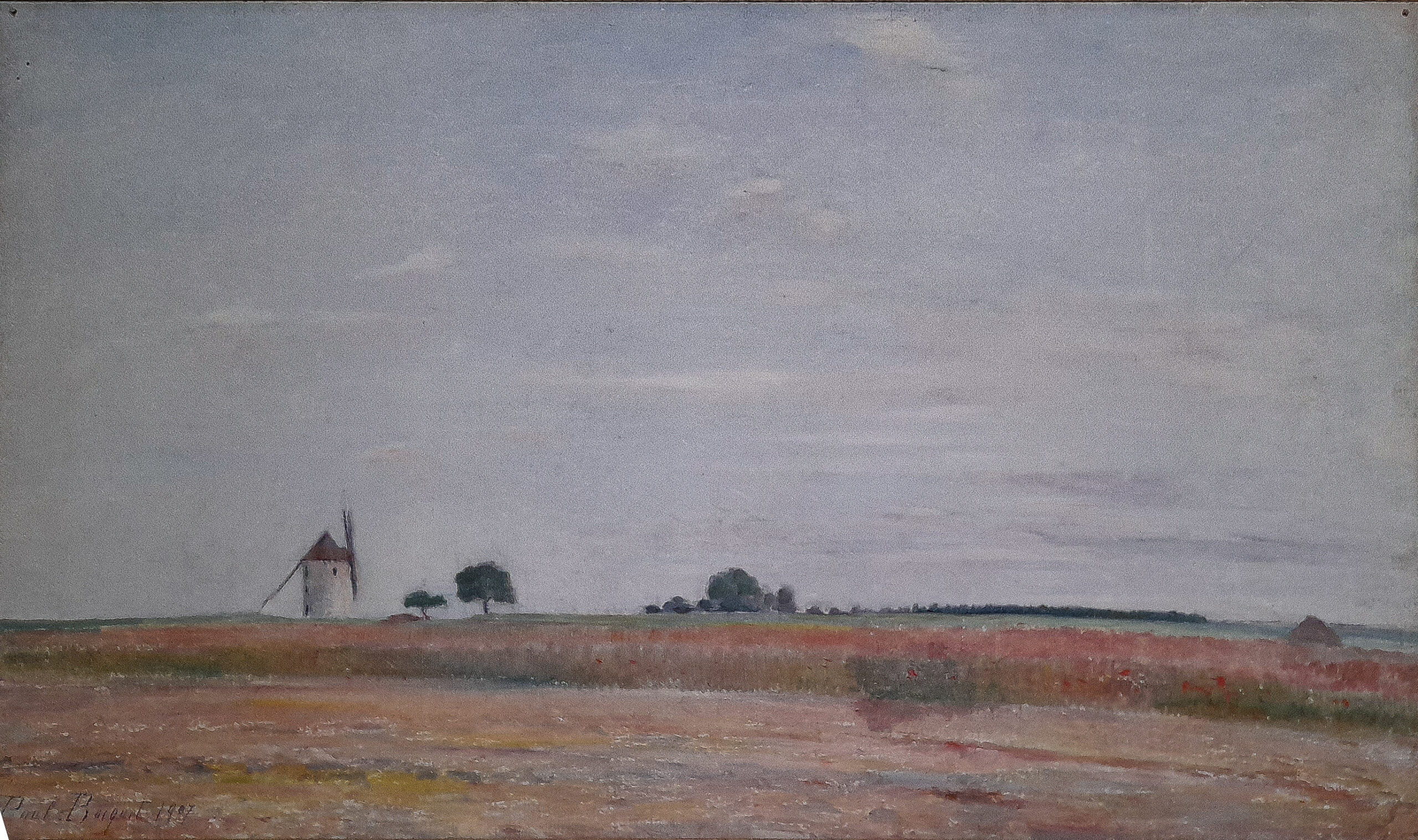 Parmi les paysages peints à Togny-aux-Bœufs, plusieurs toiles montrent les moulins à vent dressés dans les champs, souvent accompagnés de meules ou de tas de gerbes. Ce motif, que Paul Bocquet reprend à différentes reprises, lui permet d’étudier les variations de lumière dans la plaine champenoise, où les formes simples se détachent avec netteté sur l’horizon.
