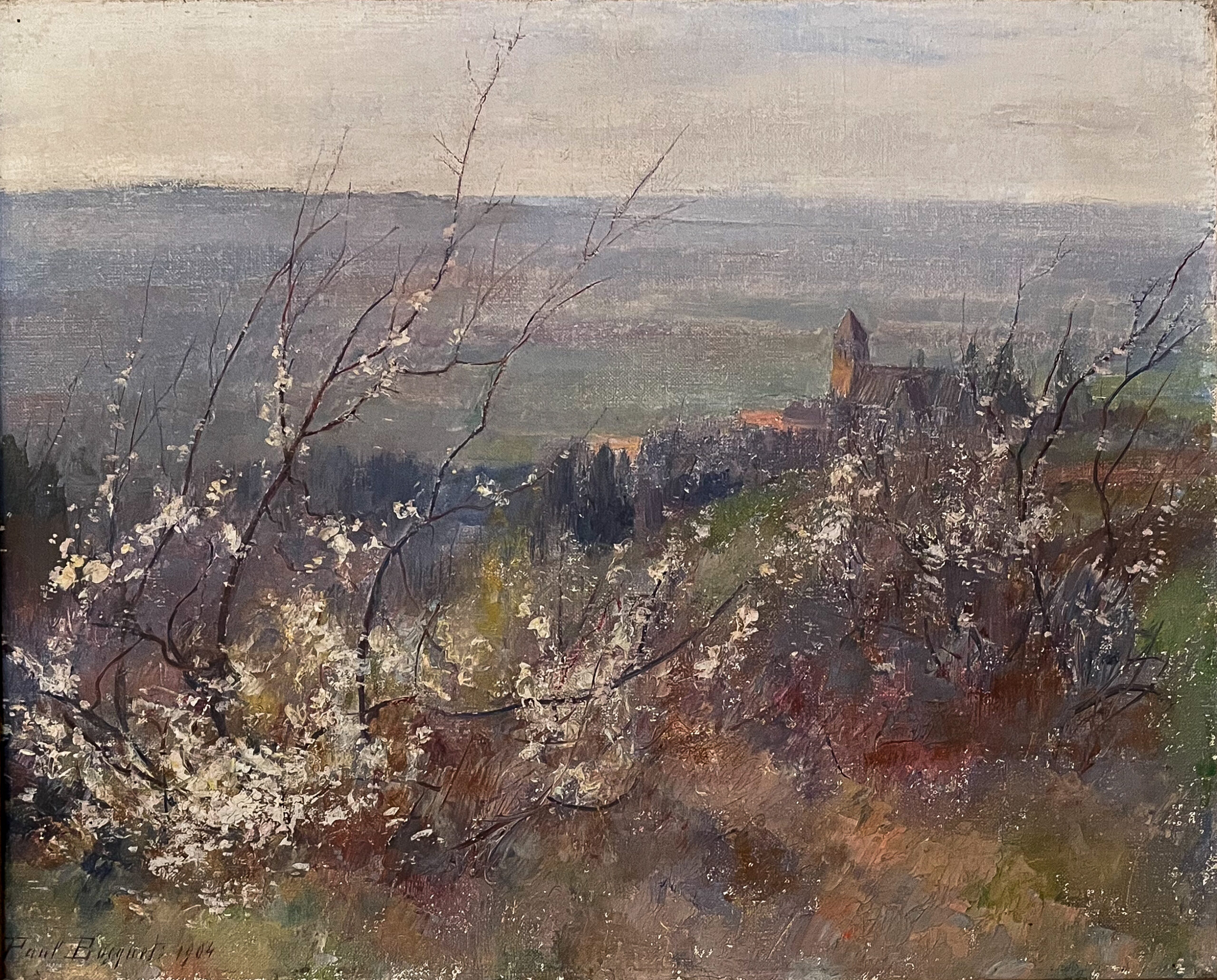 Parmi les paysages exécutés à Togny-aux-Bœufs, plusieurs toiles représentent des aubépines en fleurs, motif que Paul Bocquet reprend à différentes périodes et qui témoigne de son attention particulière aux saisons. Ces sujets, observés dans les champs ou au bord des chemins, lui permettent d’étudier les effets de lumière du printemps, lorsque les haies blanches se détachent sur les cultures et sous un ciel clair.
