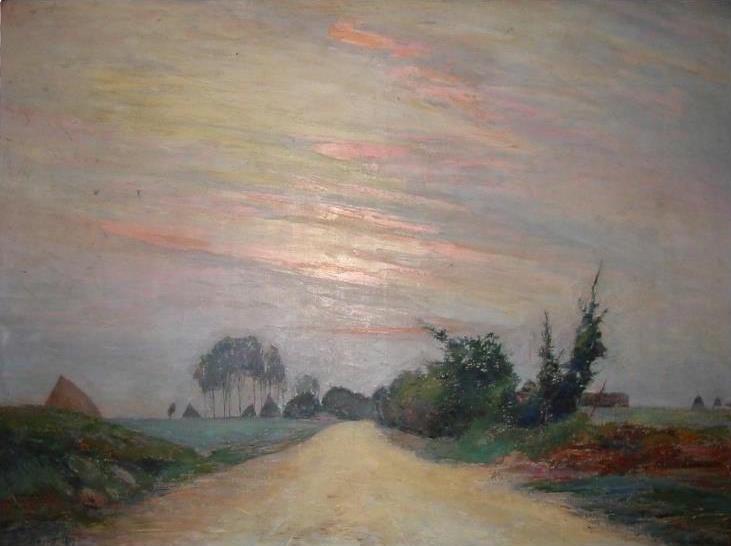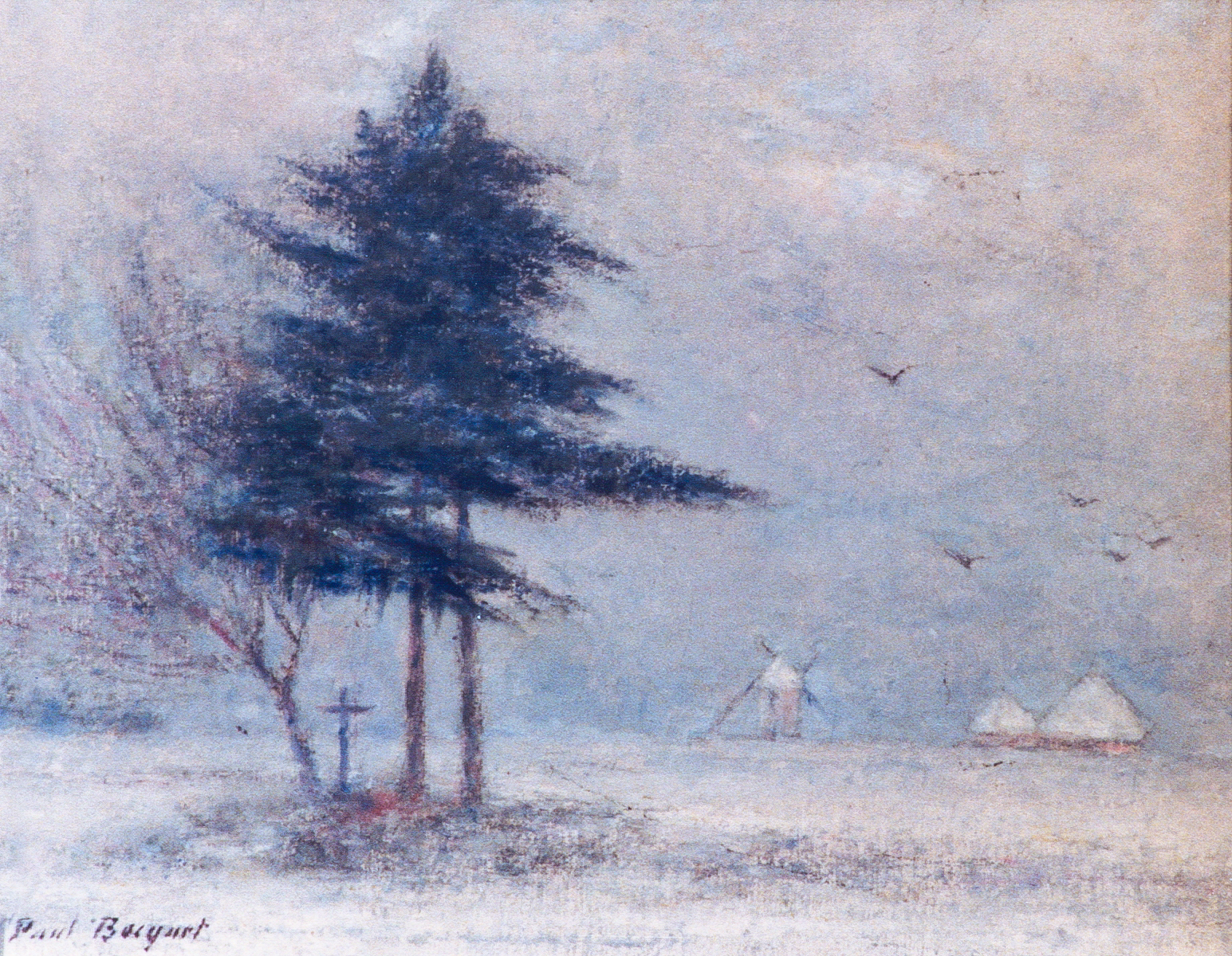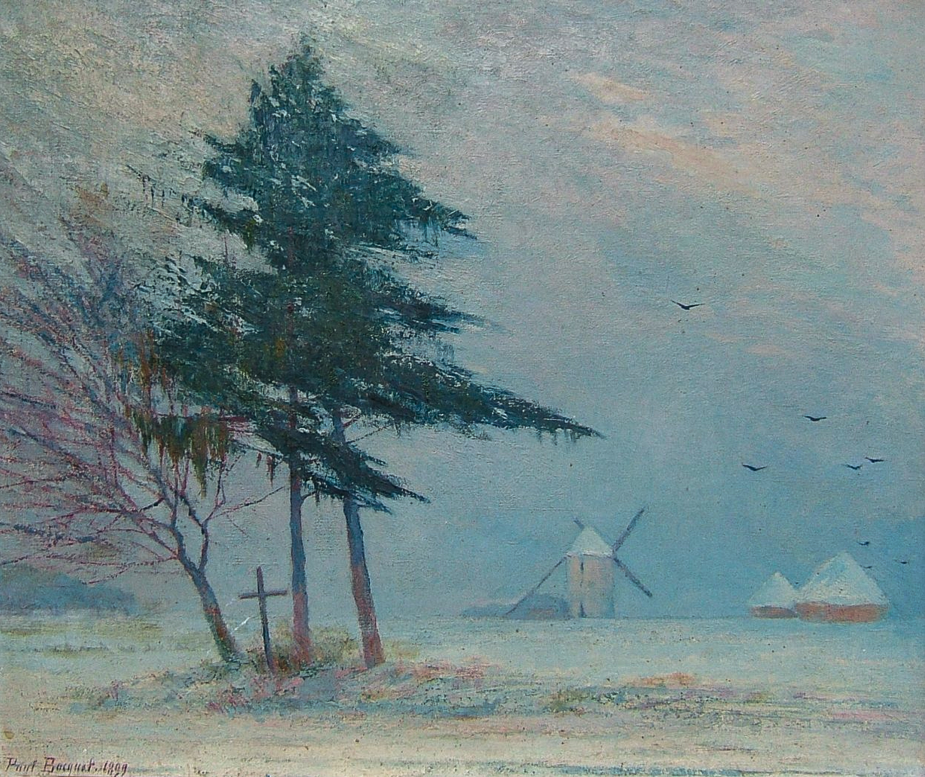 C’est dans la plaine que – sa toile protégée des flocons de neige par le grand parapluie tenu par sa jeune femme – il brosse d’un jet l’un des motifs les plus simples, mais très romantique : deux arbres maigrelets et un sapin aux branches déformées par le vent de la plaine, entourant une croix au bord du chemin. Au loin, dans la brume, un moulin et des meules. Dans le ciel lourd, plombé, quelques corbeaux. La nudité froide de la plaine, un sentiment aigu de vérité et de solitude s’expriment dans cette petite toile de 55 x 46 cm que le peintre a toujours gardée, souvenir de cette période de sa vie, dont le motif faisait contraste avec son bonheur.