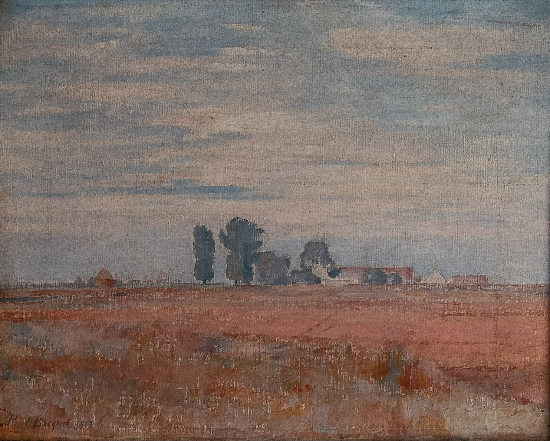 Le village de Togny-aux-Bœufs, situé dans la grande plaine champenoise, occupe une place importante dans l’œuvre de Paul Bocquet. Contrairement aux paysages du Soissonnais, faits de vallées, de bois et de chemins encaissés, Togny lui offre un horizon ouvert, presque dépouillé, où la composition se construit sur la ligne du sol et l’étendue du ciel.