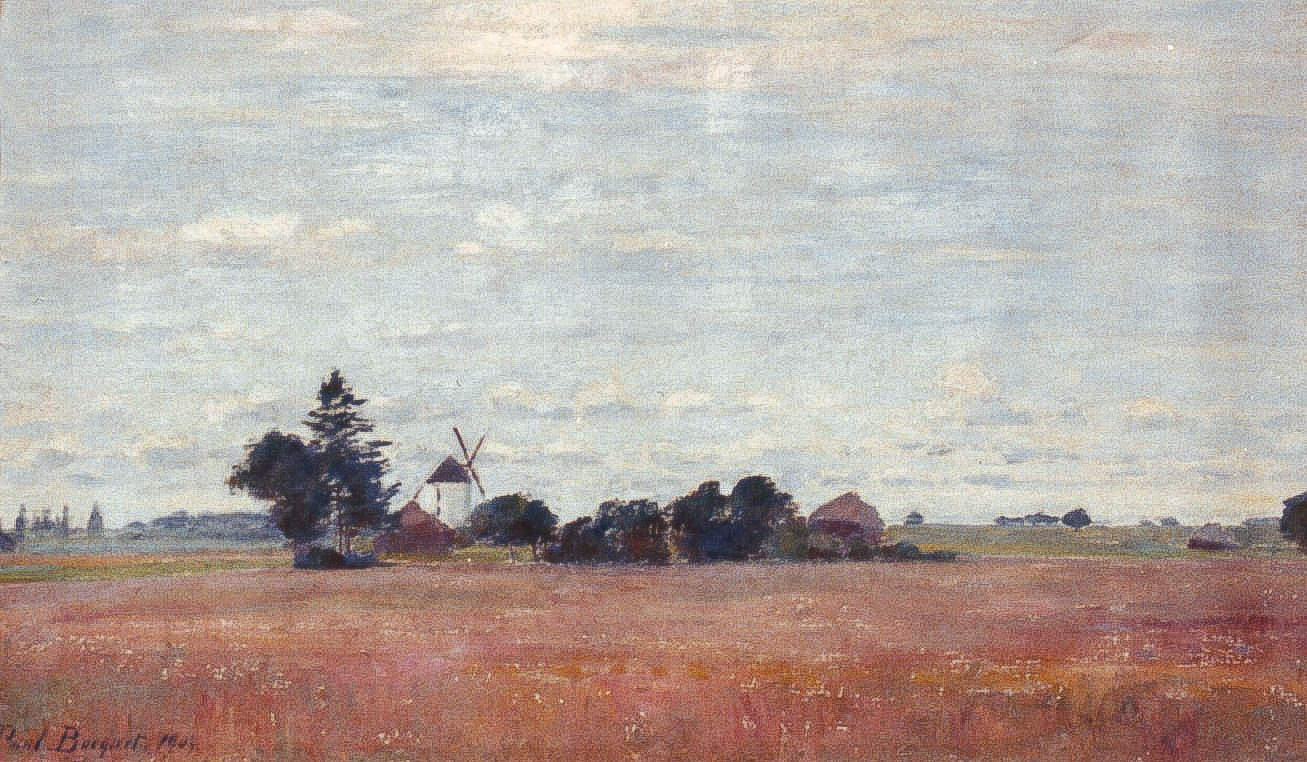 À Togny, Bocquet travaille souvent sur des motifs très dépouillés : une ligne d’horizon, quelques arbres, un moulin isolé, une meule dressée dans un champ. Cette sobriété correspond profondément à sa sensibilité. Elle lui permet de concentrer son attention sur les variations de lumière, sur les nuances du sol crayeux et sur les changements d’atmosphère qui transforment sans cesse le paysage.