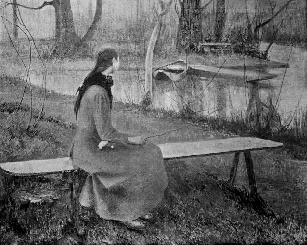 Cette toile de 1893 “Au Bord de l’eau” représente une jeune paysanne dite “la gardeuse d’oies”, assise de côté sur un banc, le visage en profil perdu, tourné vers la rivière. Au deuxième plan, deux barques accrochées à la rive des troncs d’arbres dont on ne voit que les parties basses. Pas de ciel, mais le banc, ce que l’on voit du visage, les reflets dans l’eau, tout paraît cependant éclairé, dans une grisaille d’hiver légère et très poétique. Malheureusement cette description repose sur un cliché photographique, car la toile achetée avec plusieurs autres œuvres en 1903 par Mr. Nouvion Jacquet, a été brûlée pendant la guerre de 1914. Seul le motif nous reste grâce au cliché en noir et blanc du tableau qui a d’ailleurs servi à l’artiste pour une nouvelle interprétation à l’huile, en petit format, qu’il s’est amusé à faire quand il était âgé, et qui ne peut aucunement sur le plan pictural être rapprochée de la première impression.
