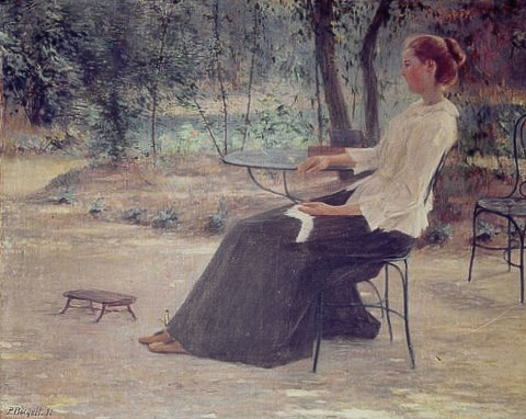 Encouragé par son admission au Salon de la Nationale de 1892 et conseillé par Roll, il s’impose des toiles de plus grand format dans lesquelles il s’oblige à introduire un personnage. Profitant ainsi de la présence de sa sœur Juliette à la Villa Montmorency (à Auteuil) où sa famille maternelle (Langlet) va résider jusqu’à la fin de la législature, il la peint, lui faisant faire de longues poses dans le jardin de la villa pendant les fortes chaleurs de juillet 1892. Sur cette toile, sa sœur, modèle complaisant, est assise, le bras droit accoudé à une table de jardin sur laquelle se trouve sa boite à ouvrage. Une dentelle posée sur elle est retenue par la main gauche. Juliette est de profil, les cheveux tirés en arrière, rassemblés en chignon. Son ample robe traîne jusqu’à terre et laisse à peine apercevoir la pointe des chaussures. Une chemisette blanche, sorte de caraco, avec une collerette en dentelles et des manches à volants qui s’arrêtent au coude, marque le buste, qui semble gracile par rapport au reste du corps. Au deuxième plan, c’est le jardin, troncs d’arbres et arbustes légers. Pas de ciel. Mais le soleil traverse le feuillage et éclaire l’ensemble par des taches larges et lumineuses, surtout marquées au premier plan dans l’allée, et dans la verdure à l’arrière-plan. Les lumières et les ombres sont harmonieusement répartie. Ce tableau qu’on sent peint sous l’influence directe du Roll de “La Laitière”, a été exposé au Salon des Amis des Arts à Reims en Octobre 1892, puis donné ensuite à Juliette elle-même.